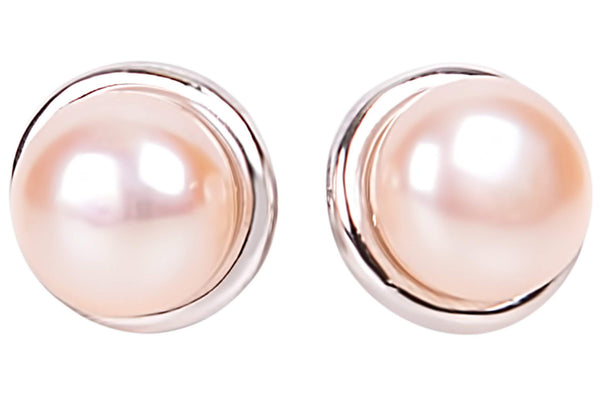 This pair of peach stud earring made with 8mm freshwater pearls and set in sterling silver setting around the pearls