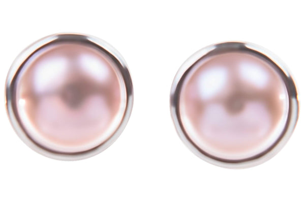 This pair of purple stud earring made with 8mm freshwater pearls and set in sterling silver setting around the pearls