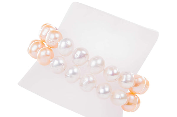 This classic double strand mixed color, white, peach, and purple cultured freshwater pearl bracelet is hand-knotted with 9-10 mm off-round pearls and finished with a 16mm 18k white gold plated magnetic clasp. The length for this bracelet is 8" and these off-round pearls have a white brilliant rich overtone and luster color.