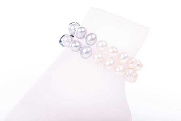 This classic double strand mixed color, white, grey, and dark blue cultured freshwater pearl bracelet is hand-knotted with 9-10 mm off-round pearls and finished with a 16mm 18k white gold plated magnetic clasp. The length for this bracelet is 8" and these off-round pearls have a white brilliant rich overtone and luster color.