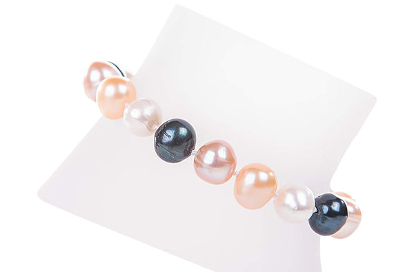 This classic strand multi-color cultured freshwater pearl bracelet is hand-knotted with 9-10mm pearls and finished with a 10mm 18k white gold plated magnetic clasp. This bracelet has a length of 7.5" and these off-round pearls have a brilliant rich luster color.