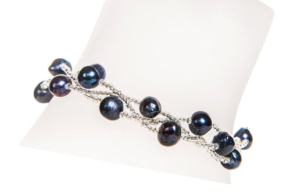 This classic beautiful 7mm blue cultured freshwater pearl bracelet is handmade with clear beads, 3 strands of pearls braided together and finished with a 12mm 18k white gold plated crystal magnetic clasp totaling to a length of 8".