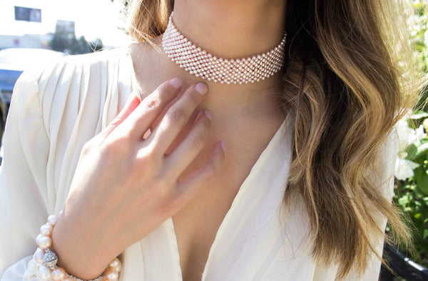 The choker is one of the hottest jewelry trends this year and we've updated with pearls. This choker is all handcrafted with 4mm pink freshwater pearls and a sterling silver clasp which it is also coated with 18K white gold over the sterling silver clasp so it won't tarnish. The length for this necklace is 14" plus 1 1/2 extension chain in the back, so it can be adjusted to 15 1/2" if needed.