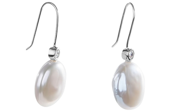 White Freshwater Coin Pearl Dangle Drop Earrings with Sterling Silver 16mm