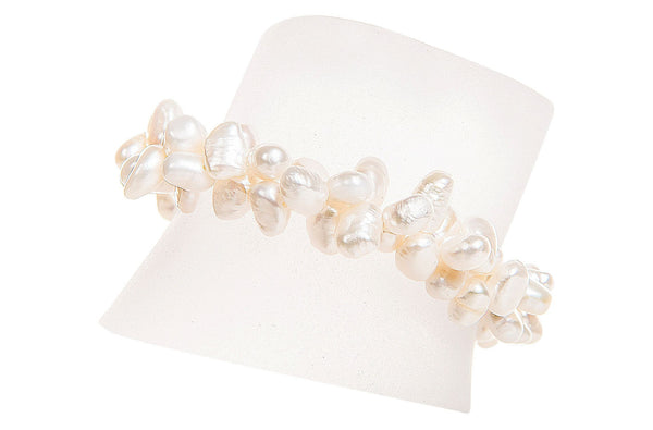 This double strand twisted irregular white cultured freshwater pearl bracelet is hand-knotted and finished with a 16mm 18k white gold plated magnetic clasp. This bracelet is adjustable between 7" to 8" by twisting or untwisting. The pearls are in the delicate size range of 5-7mm.
