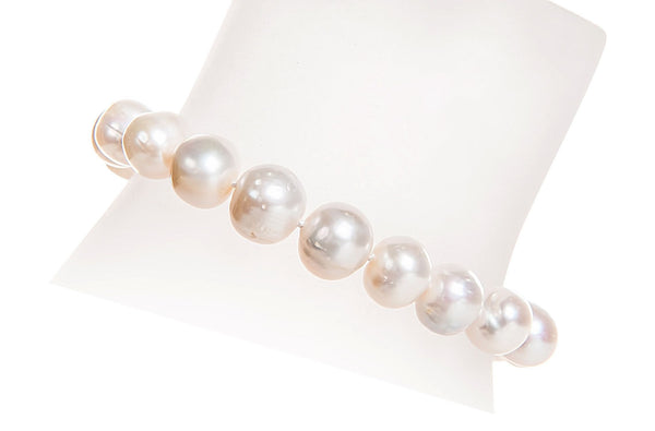 This classic strand white cultured freshwater pearl bracelet is hand-knotted with 9-10mm pearls and finished with a 10mm 18k white gold plated magnetic clasp. This bracelet has a length of 7.5" and these off-round pearls have a white brilliant rich overtone and luster surface.