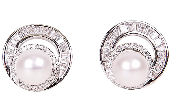 This pair of white cultured freshwater pearl earring studs are made with 2 8mm pearls with cubic zirconia set in sterling silver (925) setting. The sterling silver setting are white gold plated with 18k white gold so they won't tarnish.