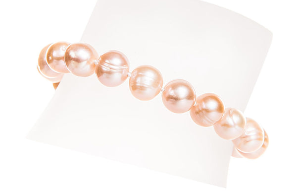 This classic peach cultured freshwater pearl necklace and bracelet set is hand-knotted with 9-10mm pearls and finished with a 10mm 18k white gold plated magnetic clasp. The bracelet has a length of 7.5" and these off-round pearls have a peach brilliant rich overtone and luster color. The necklace has a length of 17" and these off-round pearls have a peach brilliant overtone and luster colors.