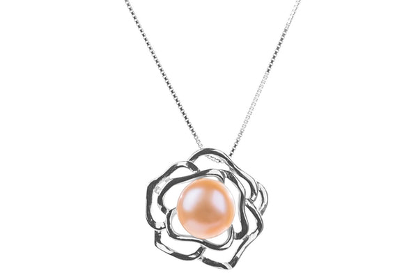 This pendant is made with a 9mm peach cultured freshwater pearl set in a rose flower shape stertling siver (925) setting. The entire necklace is gold plated with 18k white gold over the sterling silver so it won't tarnish. The pearl have a peach brilliant rich overtone color and smooth luster surface. The length for this necklace is 16" plus 2" extension.