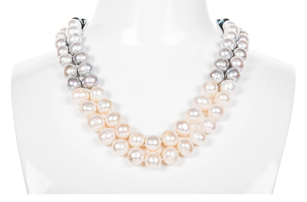 This classic elegant multi-color off-round double strand layer cultured freshwater pearl necklace is hand-knotted with 10mm pearls and finished with a 16mm 18k white gold plated magnetic clasp. These off-round pearls have a brilliant rich overtone and luster color. The length for the top strand is 17" and for the bottom strand is 18".