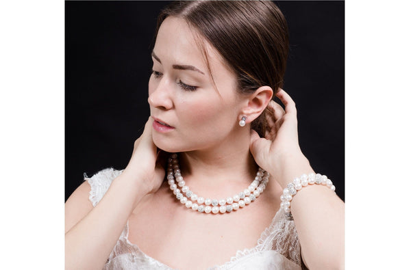 This stunning white color double strand cultured freshwater pearl necklace and bracelet set is hand-knotted together with 10mm crystal ball and 10mm round pearl and finished with a 16mm 18k white gold plated magnetic clasp. The necklace is finished with a 16mm 18k white gold plated magnetic clasp and the length for the short strand is 17" and the long strand is 18". The bracelet has a length of 8" and these off-round pearls have a white brilliant rich overtone and luster surface.