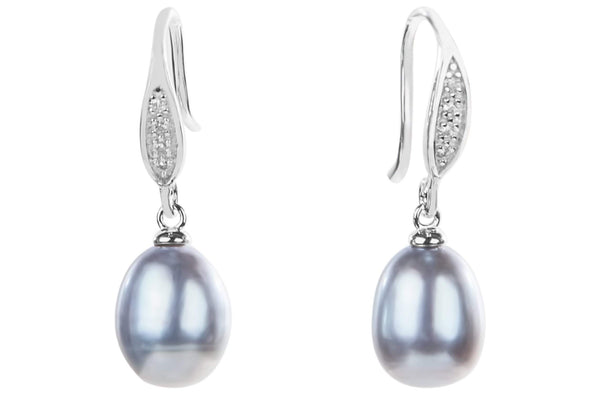 This pair of dangle drop grey cultured freshwater pearl earring made with 9mm rice shape pearls, cubic zirconia, and sterling silver (925) hooks. The entire earring hooks are gold plated with 18k white gold over the sterling silver so they won't tarnish. These pearls have a grey brilliant rich overtone color and a smooth luster surface.
