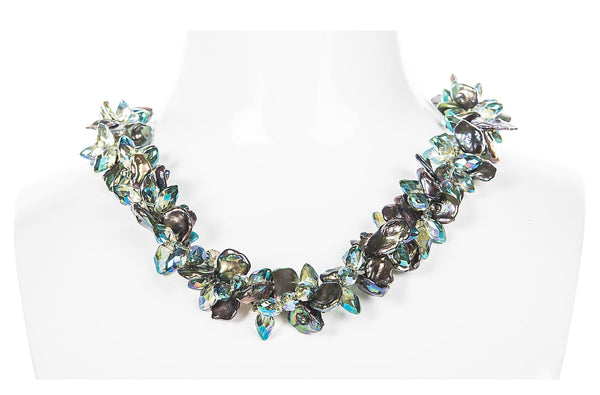 This stunning green cultured freshwater Keshi pearl necklace is hand-crafted and twisted with green crystals, finished with a 16mm 18k white gold plated magnetic clasp. The length is easily adjustable between 18" to 21" by twisting or untwisting.