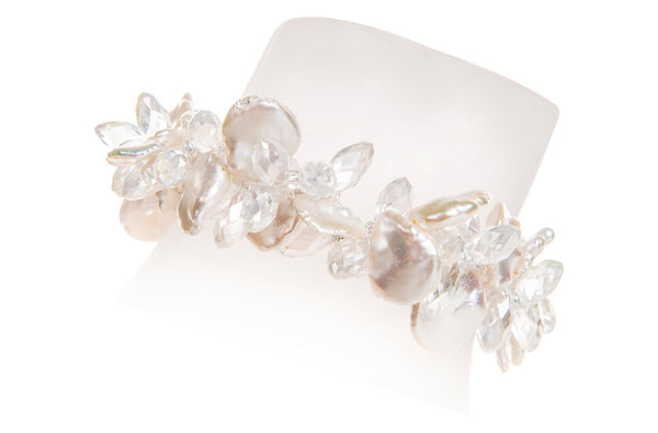 This stunning white cultured freshwater Keshi pearl bracelet is twisted with white crystals and finished with a 16mm 18k white gold plated crystal magnetic clasp. This bracelet is adjustable between 7.5" to 9" by twisting or untwisting.