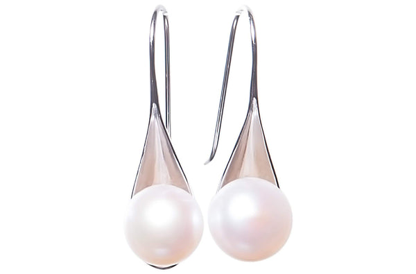 This pair of dangling earring made with 10mm freshwater pearls with sterling silver setting, also placed with 18k white gold over the sterling silver, so they won't tarnish. These pearls have a white brilliant rich overtone color and a smooth luster surface.