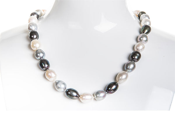 This single strand rice shape mix color cultured freshwater pearl necklace is all hand-knotted with 11mm-13mm pearls and finished with a 12mm 18k white gold plated magnetic clasp.