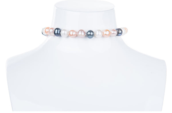 This chocker is all hand-knotted with 9mm to 10mm off-round mix color cultured freshwater pearls, finished with an 10mm 18K white gold plated magnetic clasp. The length for this necklace is 15."