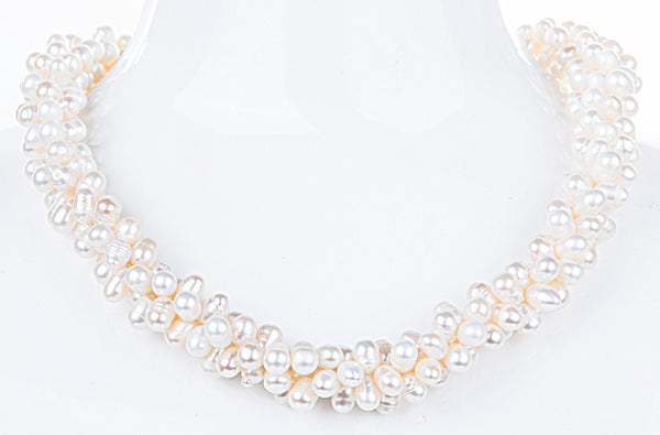 This triple strand twisted cultured freshwater white pearl necklace is hand-knotted with 6mm pearls and finished with a 16mm 18k white gold plated magnetic clasp. This necklace is adjustable between 18" to 20" by twisting or untwisting.